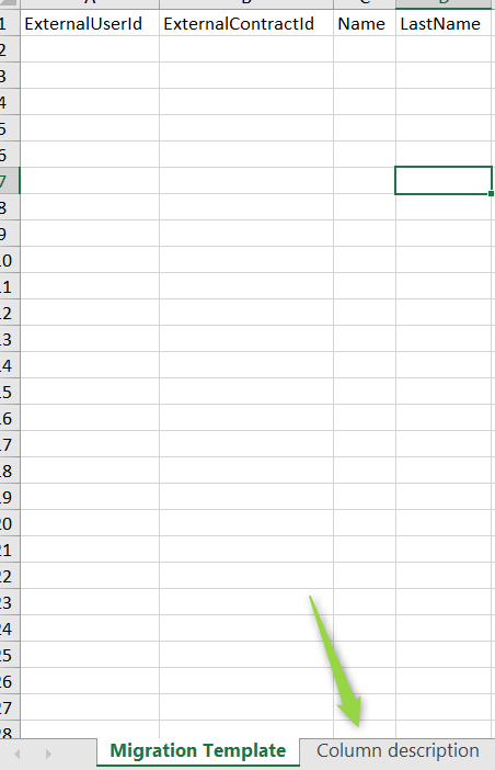 - Your template has 2 tabs. On the first tab, you have the table where in each row you provide data for migrated Users. On the second tab, you can find the description of each column ( Description, what Information is required, eventual values)