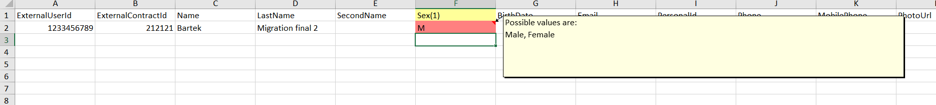 - ExternalUserId: described as Member's Id number from external system, for migration purpose you may use ID number that been assigned to the user in previous system, or you may ente rany value as long as it’s unique for each Guest or Member. If you upload several User templates into PGM, please make sure the externalUserID doesn’t exists in the system, cause otherwise you won’t be able to update profile data, and you may only add a new contract on the account. The only exception to duplicating it in the file is when you upload more than one contract for a single member. It won’t display in PGM after the migration.