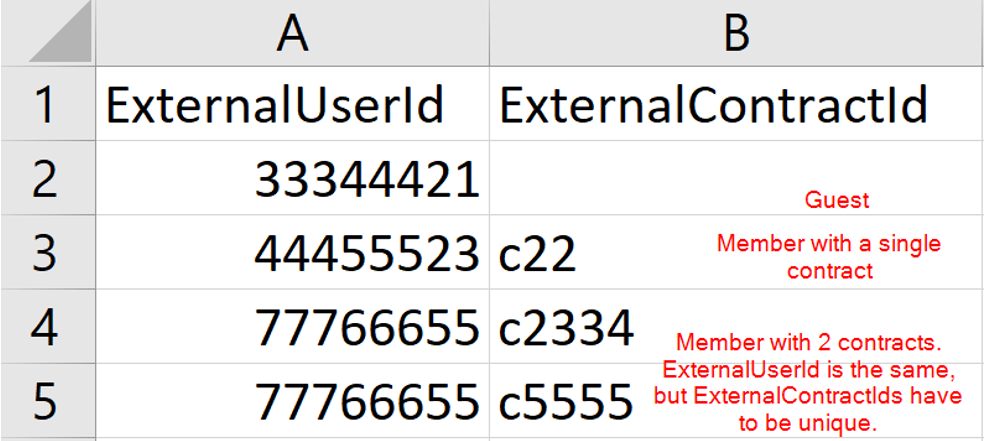 - ExternalContractId: described as Contract Id number from external system. You may use agreement/contract id that was provided in the previous system, or you may ente rany value as long as it’s unique for each row and it doesn’t already exist in PGM. For Guests(users without any conract) leave it empty. It won’t display in PGM after the migration.