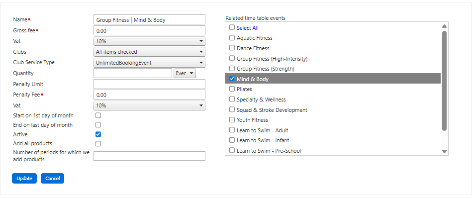 UnlimitedBookingEvent. This shows the Related time table events list but hides the Quantity field.Related time table events: Check only the "Off-Peak Classes" category in the list. Do not check Select All.