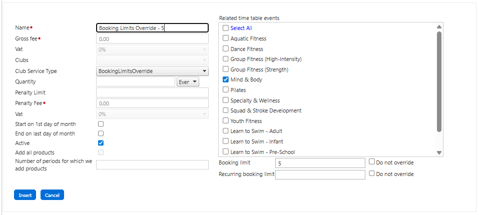 BookingLimitsOverrideGross fee: (This field will be disabled and set to 0).