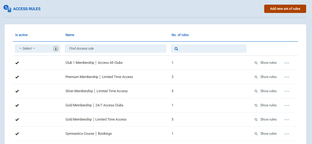 Filtering: The main list of rule sets can be filtered by status (All, Active only, Inactive Only) or by name using the Find Access rule search box.