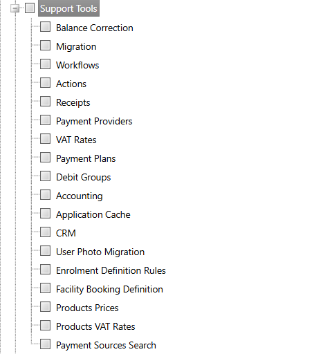 The picture displays all available permissions, but some tabs are restricted to Perfect Gym employees. Only the client-accessible tabs are detailed further in this article.