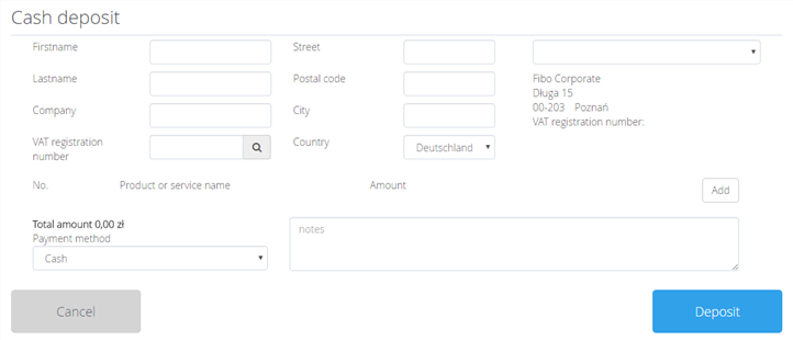 Both, cash deposit and cash withdrawal forms, come also with advanced versions, allowing you to enter more detailed information. By default, the simple versions of both documents are enabled which suffices most users. If you wish to switch to the advanced view, you need to contact the Perfect Gym Support Team.