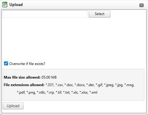 Acceptable file formats: *.331, *.csv, *.doc, *.docx, *.der, *.gif, *.jpeg, *.jpg, *.msg, *.pdf, *.png, *.rdlc, *.rrp, *.tif, *.txt, *.xls, *.xlsx, *.xml