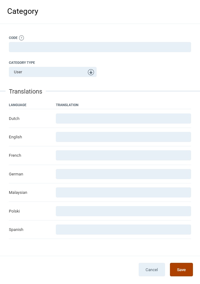 In the modal window, fill in the Category Name, Category Code, and select the Object Type it applies to.