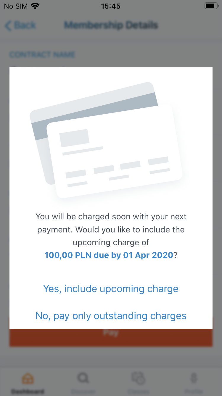 If you have any upcoming charges with due date within a month you will see information about that and you can add this payment to the transaction (if you don't pay the upcoming charges in this transaction, you will have this possibility again after returning to the membership details).