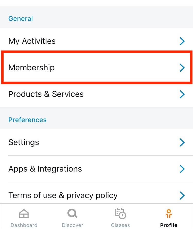 2. Tap the "My memberships" button on the dashboard or go to the "Profile" section and tap "Membership".