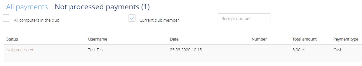 After filling in the data, click the Add receipt number and process button. The data provided will be saved and the transaction will be processed.
