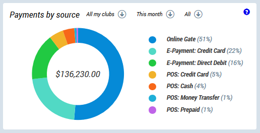 One of the easiest ways to get current state of payments in your club is to add the "Payments by source widget" to your homepage. Thanks to it, you will see the total amount of incoming payments divided into categories mentioned above.