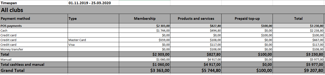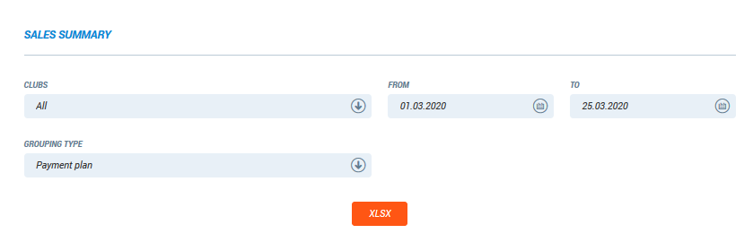 In this report you can select for which clubs and for which period you would like to get data for. In this report there is also additional tab that groups payments per certain object like payment plan or product category.