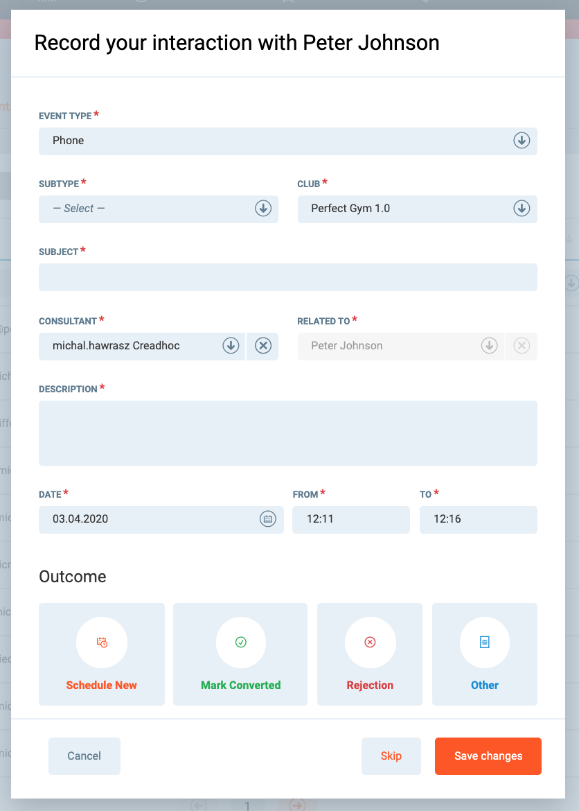 - You record your interaction with the lead when it was a call or a conversation. You will probably set the outcome to Schedule New (Convert and Rejection will be only applicable when the lead will join or reject immediately). You have the option to Skip this step when there was no call or meeting - you will be then requested to schedule a future meeting.