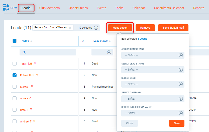Club should add Leads into the system to track their pipeline in on place. Usually, club employees tend to keep leads information in an unstructured way e.g. in personal notes, excel, as contacts on Facebook etc. This way makes it impossible for the club to control the sales and when an employee leaves a company all data is gone.