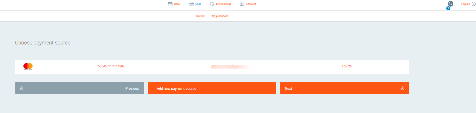 6. Chose payment source - here, the registered card number should be displayed. Verify, if this is the card you want to pay with. If so click Next to proceed.