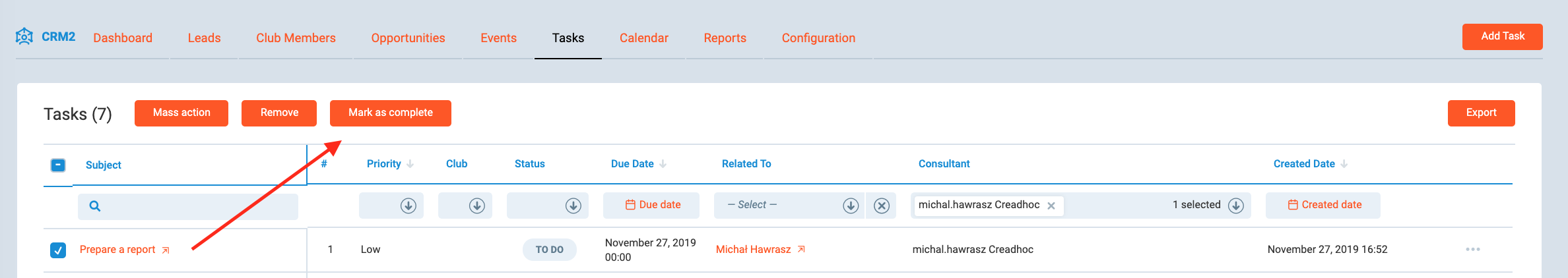 In order to complete a task, you need to change its status. You can do it in the task's details (image above) or from the task list view.