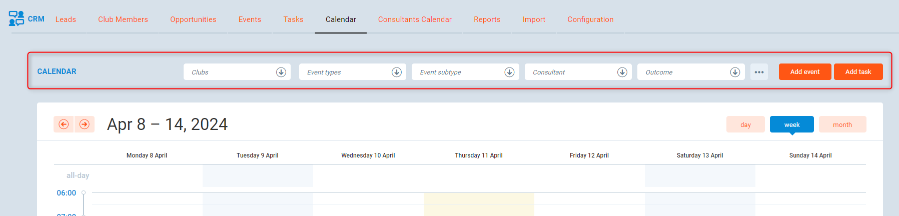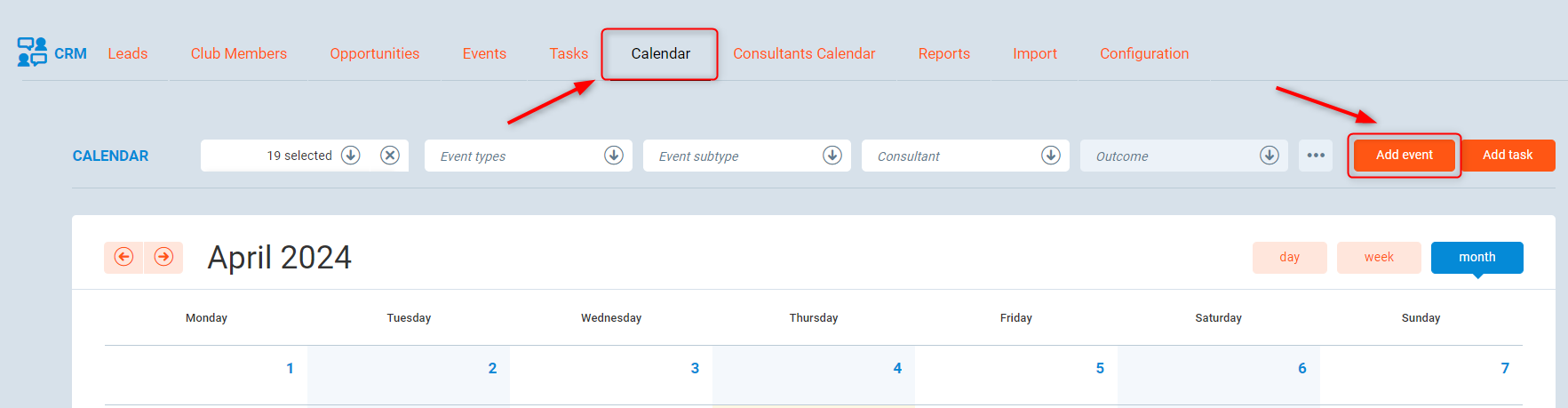 - Clubs - you can filter the calendar view by selecting the appropriate club.
