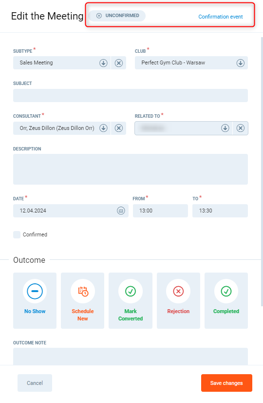 - Confirmation status - applies primarily to meetings and depends on a linked Confirmation Call (Confirmation Call can be scheduled when creating a feature meeting)
