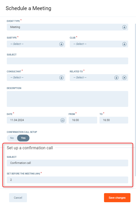 You can set how many hours before a meeting a confirmation call should take place (default value comes from configuration).