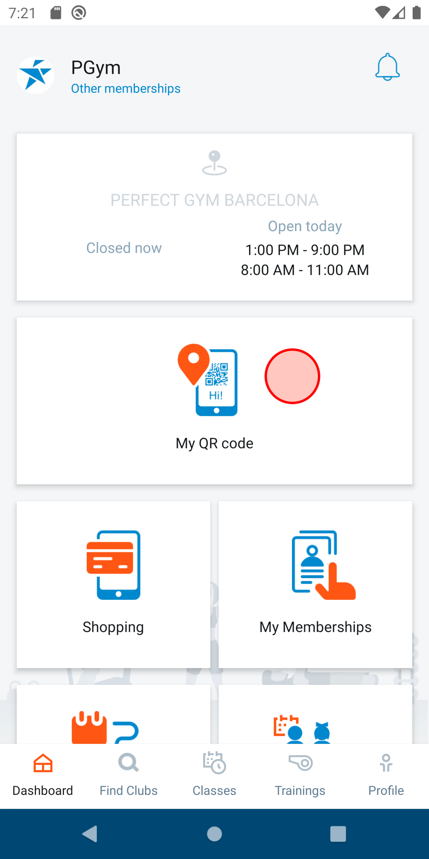 Mobile check-in must be set up first, otherwise the "check-in" tile will not be visible on the mobile app dashboard. Contact the PerfectGym Support Team and ask them to enable this functionality for you.