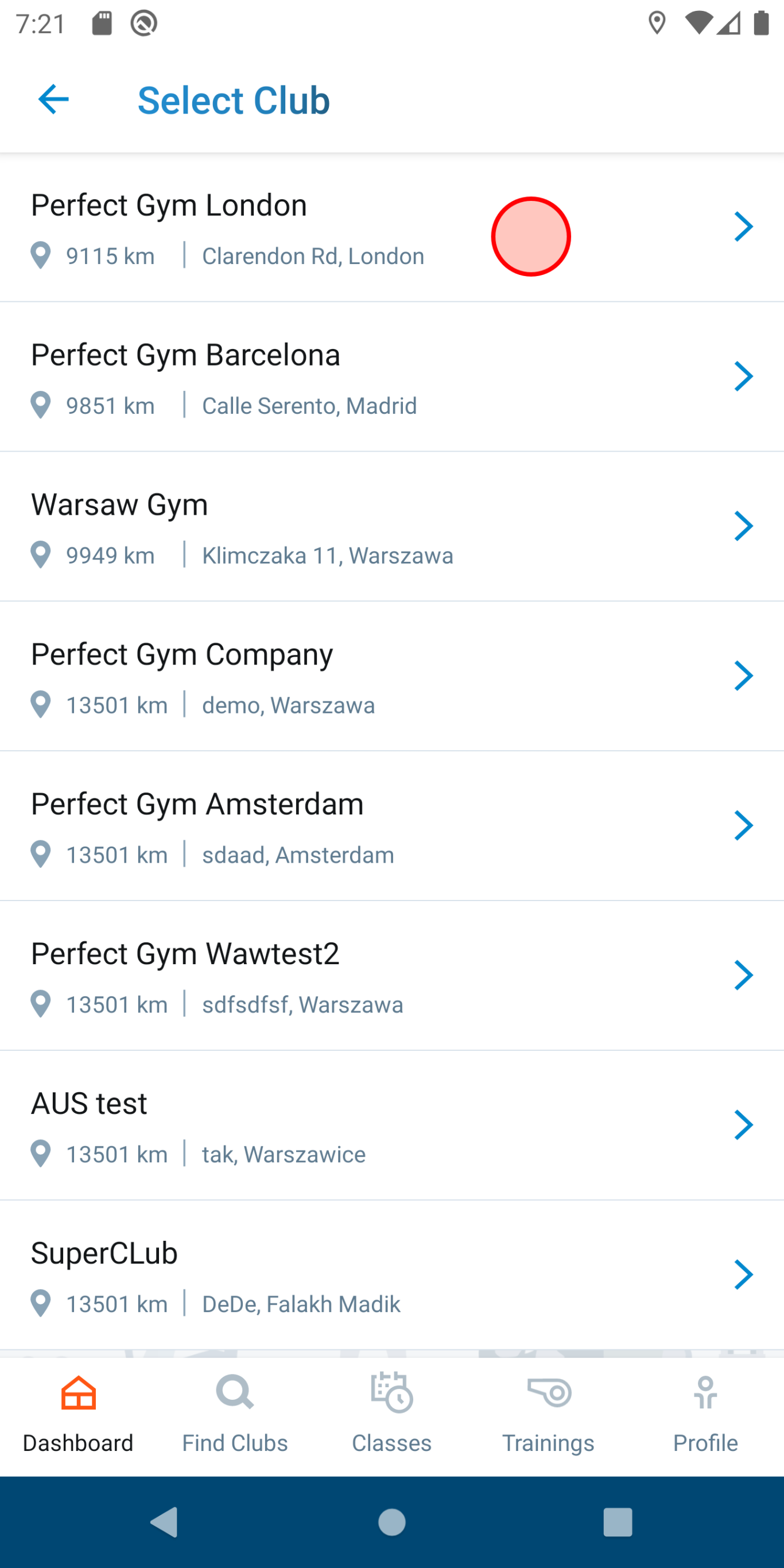 This opens a screen with club list.