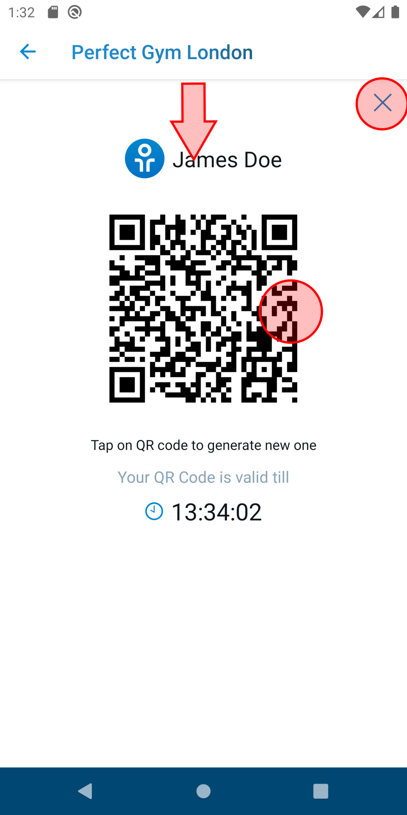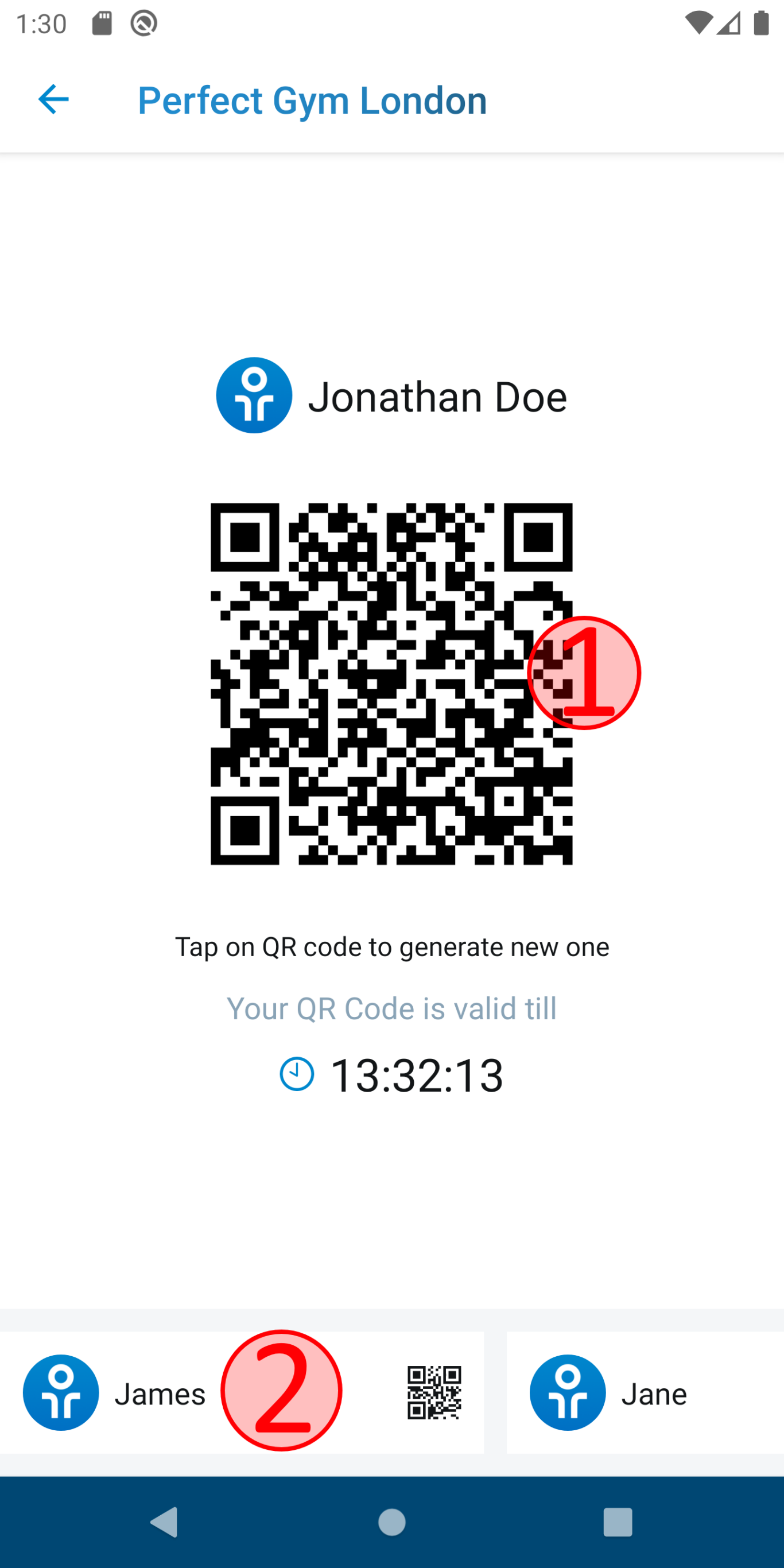 On this screen user see generated code. By clicking on QR code (1) the member can generate a new one.