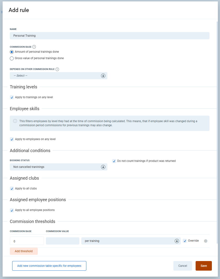Employee Levels: When configuring Personal Training commissions, remember that employee skill filters apply based on the level the employee had at the time of calculation. If their skill level changes later, commissions for past trainings might be affected upon recalculation.