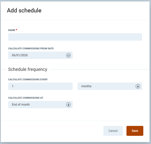 Name: This text field allows you to enter a unique title for the schedule (e.g., "Monthly Trainer Commissions"). It is a required field with a maximum length of 100 characters.