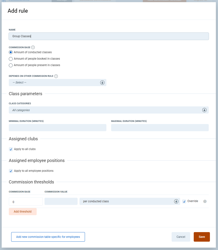 Minimal duration (minutes): Defines the minimum length a class must last to qualify for this commission.