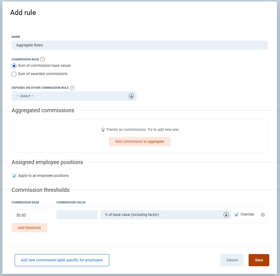 Empty States: If no commissions are added to an Aggregate rule, the system will display "There's no commissions. Try to add new one."