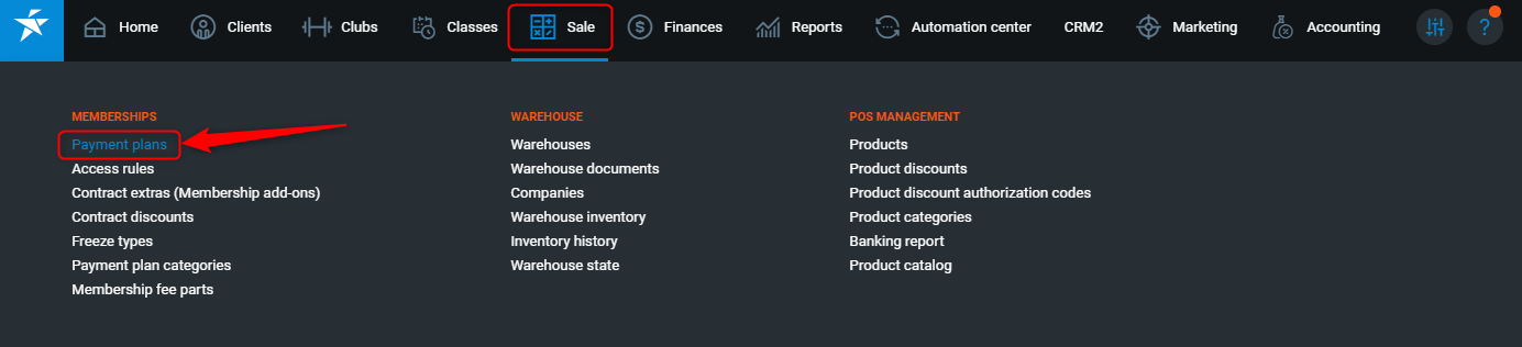 Next, go to the payment plan configuration. Click on the Sale tab and select Payment plans.