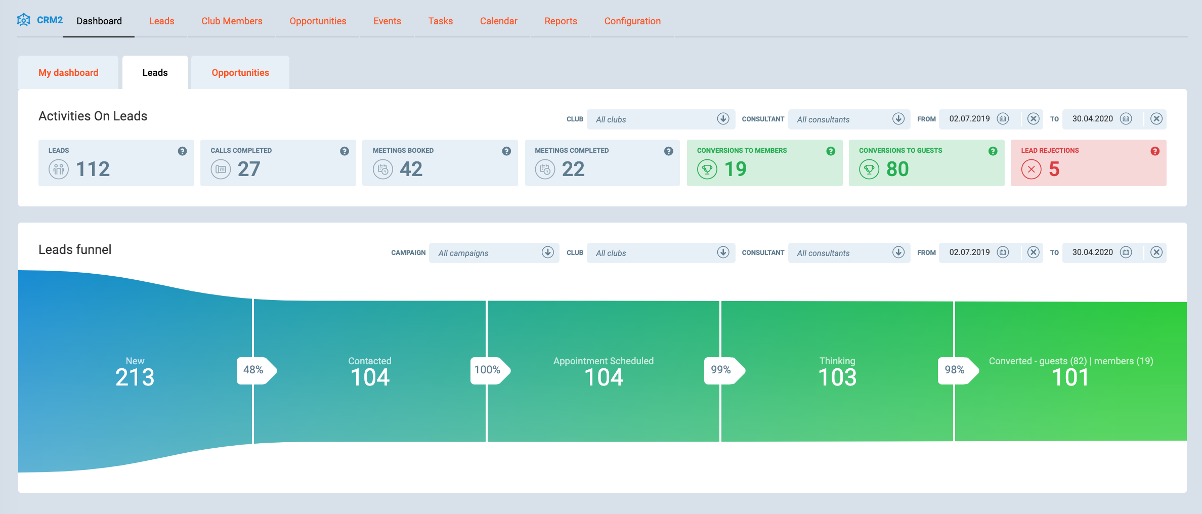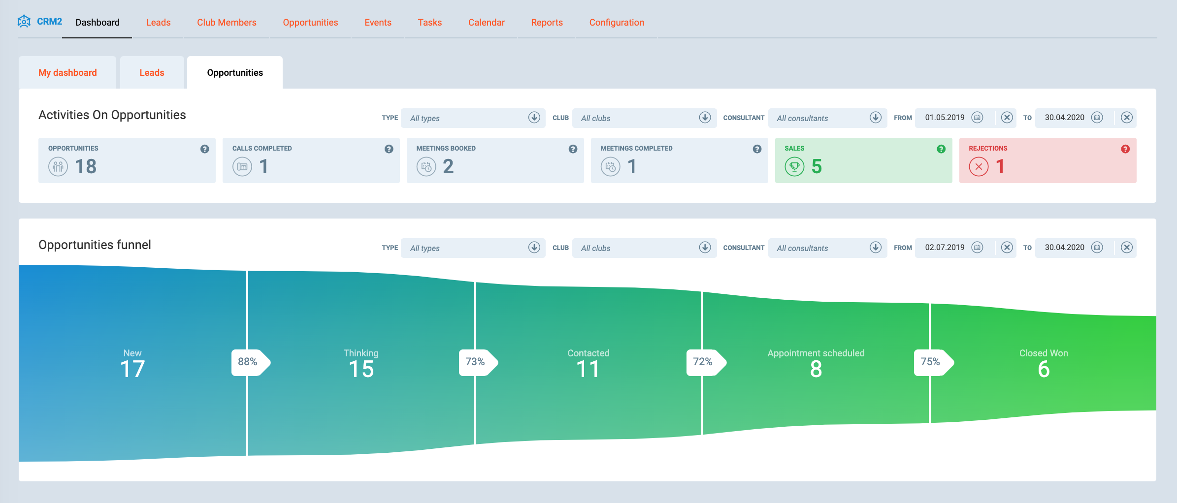 - My Dashboard - shows consultant's own metrics for Leads and Opportunities