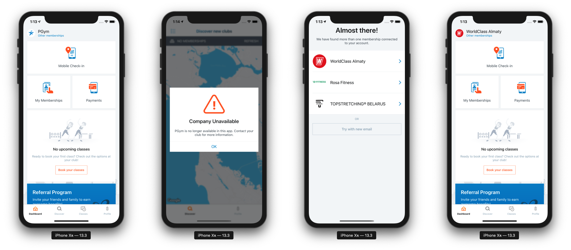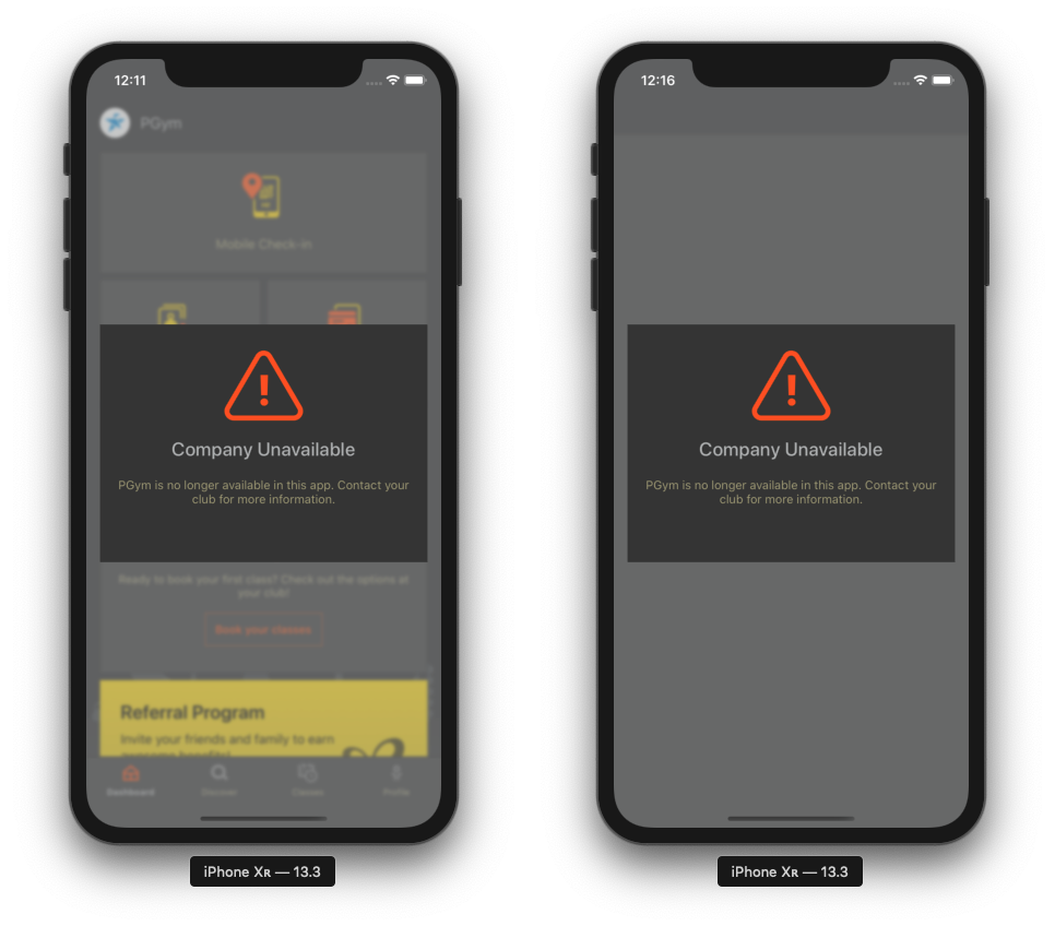 In the PerfectGym GO universal application, both flags behave in the same way. If any of these flags is set to False, the corresponding company will no longer be available in the application. If any user, at that time, has the company selected, they will be presented with a modal explaining the company's been deactivated and prompting them to select a different membership.