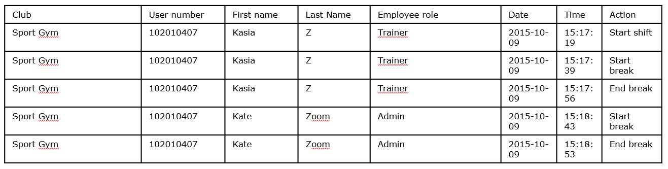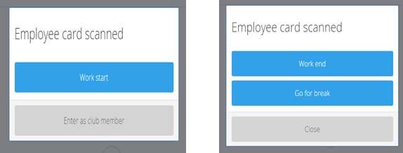 To be able to choose one of the reasons for entry / exit the club, please scan the employee band or card on the card reader at the reception and choose one of the reasons:
