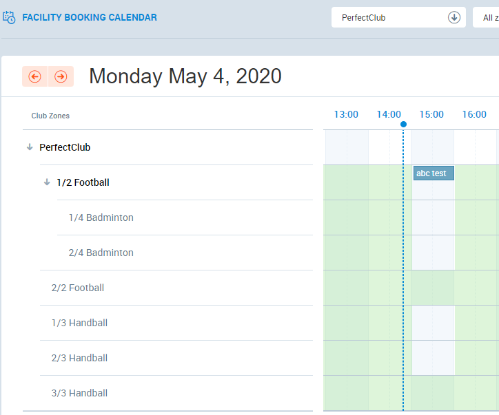 In the following example booking the '1/2 Football' zone blocks booking of its children '1/4 badminton' and '2/4 badminton' as well as booking related zones '1/3 Handball' and '2/3 handball'