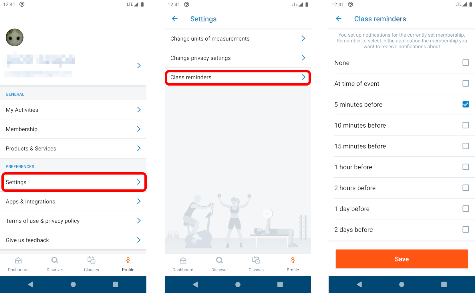 1. Open the mobile app, select the Profile tab, then tap Settings and Class reminders.