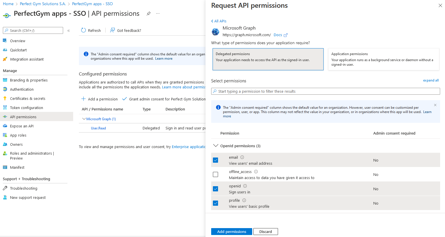 - Add permissions in the API permissions section.