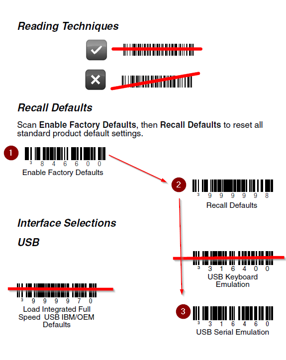 1. Restore the scanner to default settings by scanning individual barcodes in the following order: