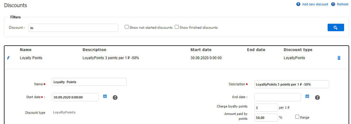 | Range | bool, checkbox | It turns on/off the interval for the amount of discount. |