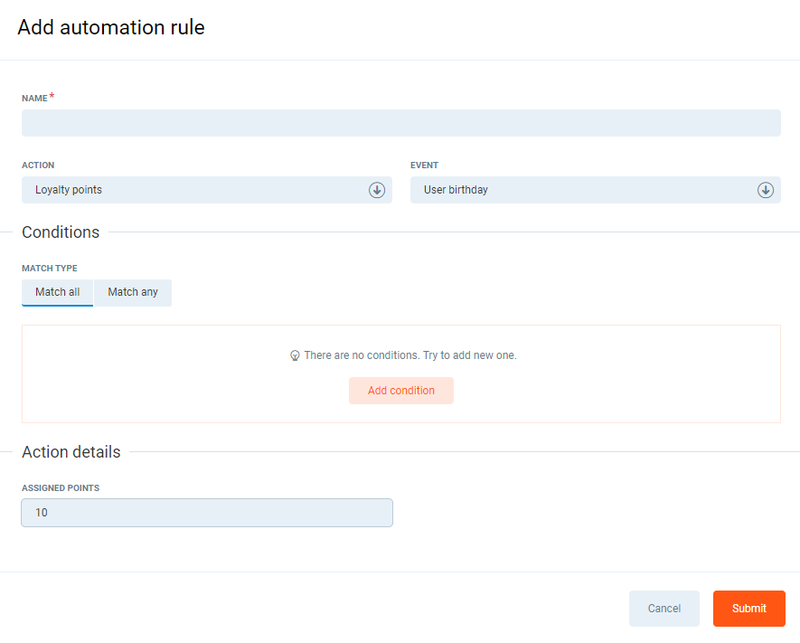 - In the Event tab, from the predefined list, select the event, which will trigger the Loyalty points adding process, i.e. User birthday.