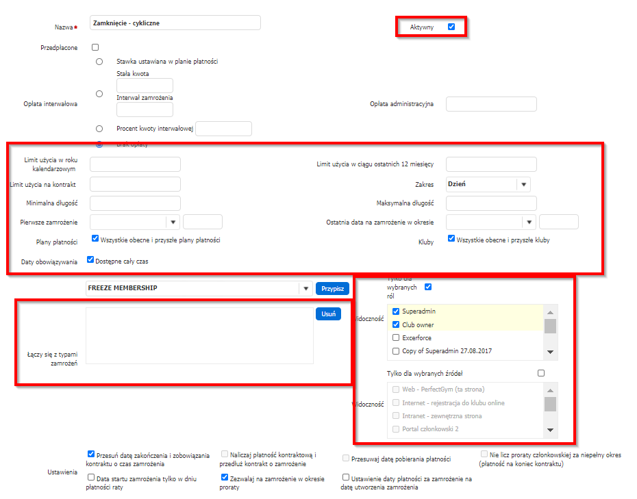 - Jeśli masz plan płatności z proratą początkową i w jej zakresie nie możesz wprowadzić zamrożenia, musisz edytować dany typ zamrożenia i upewnić się że w „Ustawieniach” zaznaczyłeś opcję „Zezwalaj na zamrożenie w okresie proraty”.