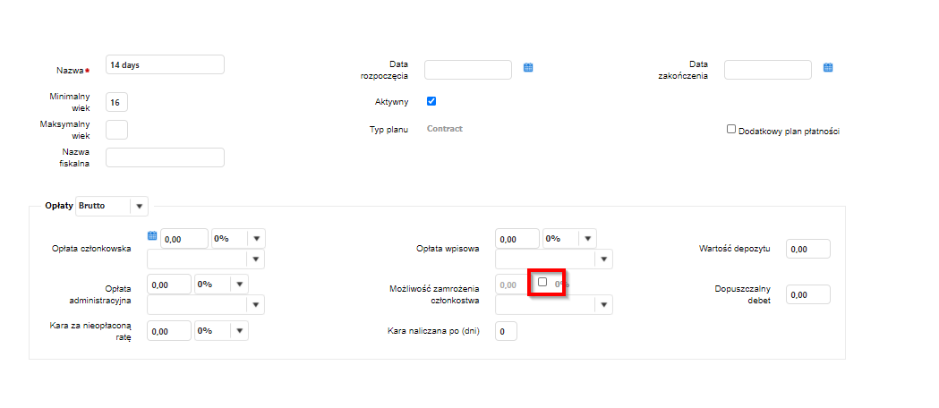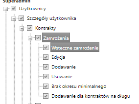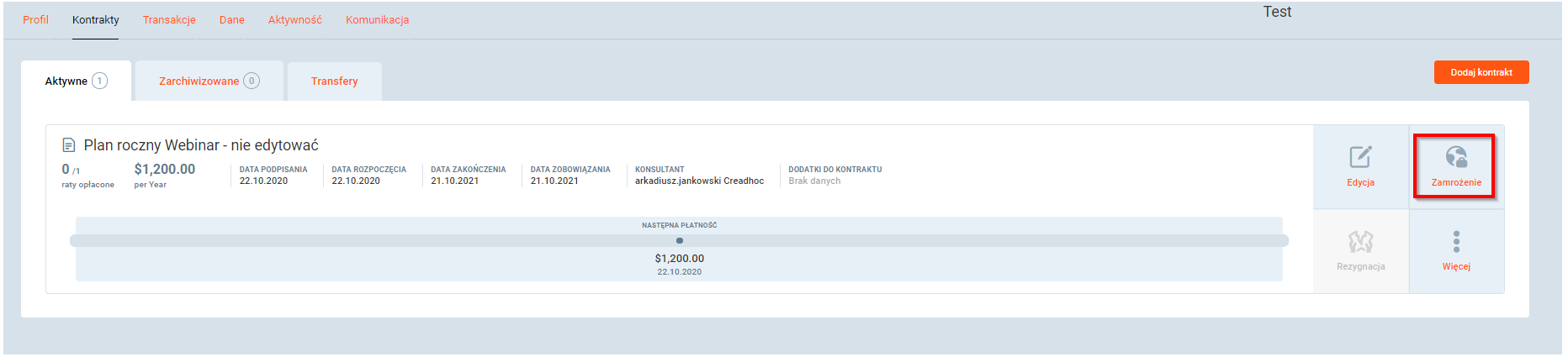 - Jeśli opcja ta jest wyszarzona, to jest to sygnał, że dany Plan Płatności ma nieaktywną opcję dot. możliwości zamrażania kontraktu.