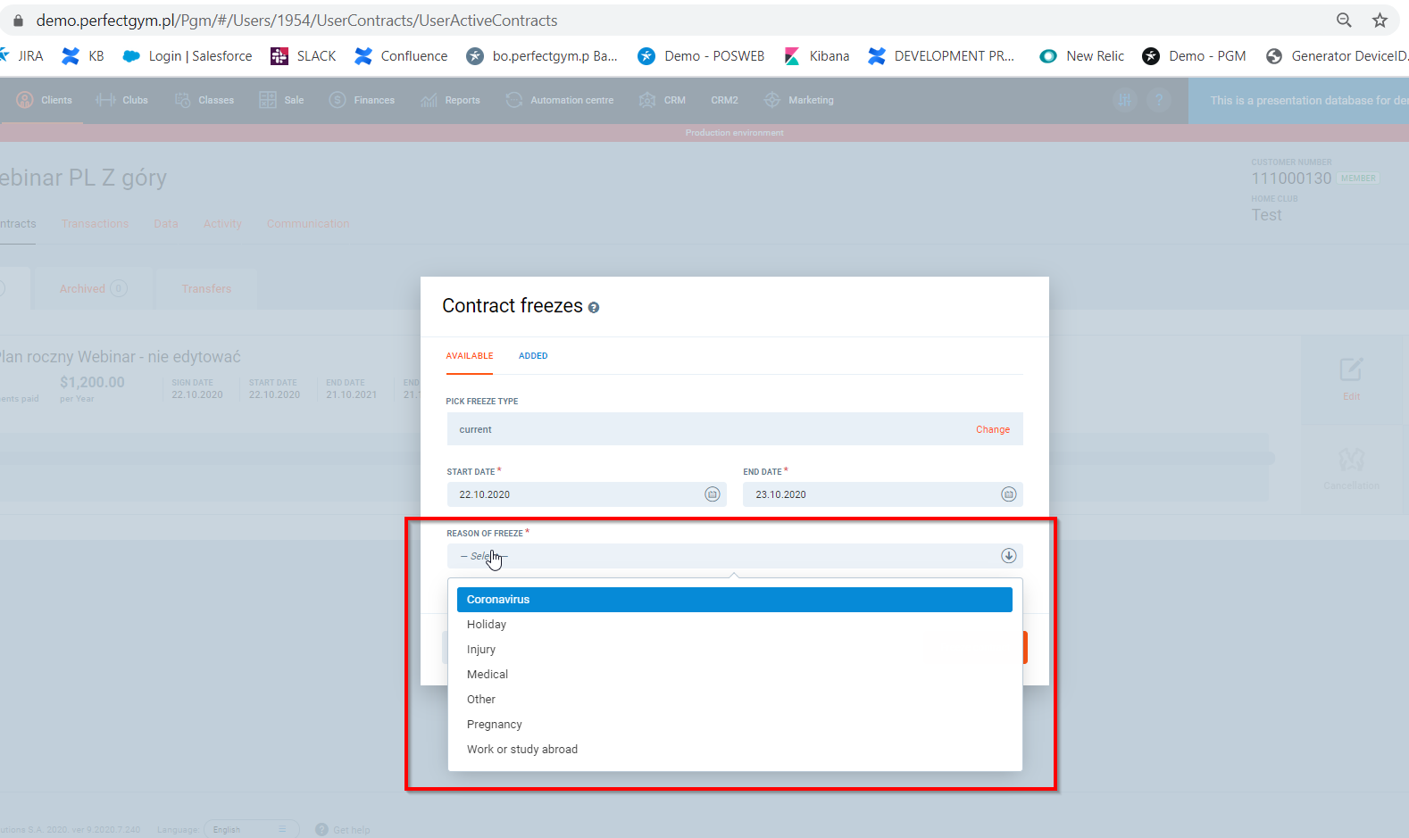 - Lack of the required FreezeReason, i.e. when you want to add a new reason: Lockdown or Coronavirus. In this case, contact the PerfectGym Support Team via the Get Support tool.