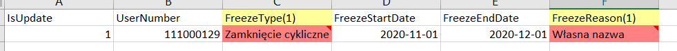 - Jeśli kolumna jest czerwona, oznacza to, że brakuje danych. Do niepoprawnych wartości zostanie dodany komentarz. Sprawdź czy użyłeś dobrego formatu daty, czy nazwa lub powód zamrożenia są poprawne.