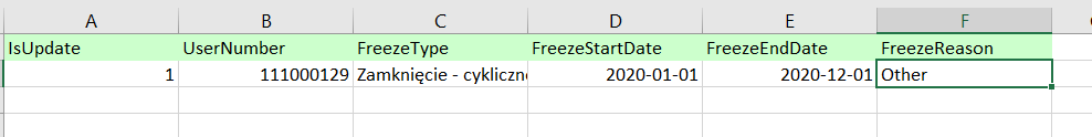 - W kolumnie D / E - FreezeStartDate / FreezeEndDate - to jest data początkowa i końcowa zamrożeń. Data końcowa będzie oznaczać konkretnie dzień kiedy zamrożenie się kończy, czyli podając datę 15.10.2020 kontrakt odmrozi się 16.10.2020.
