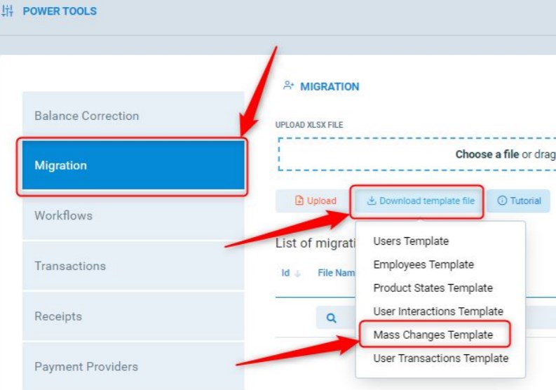 2. Wybierz Migration -> Download Template File -> Mass Changes Template
