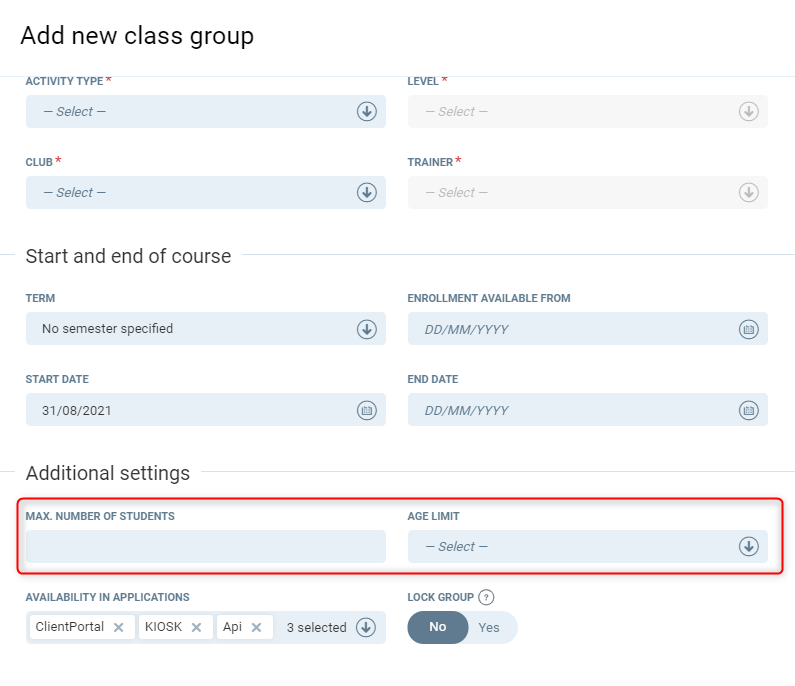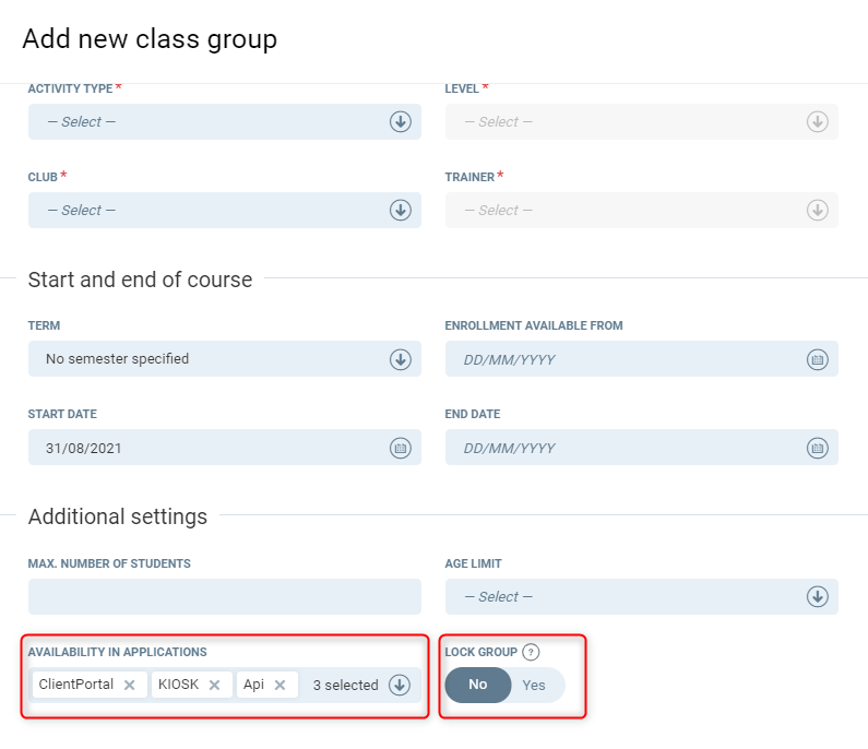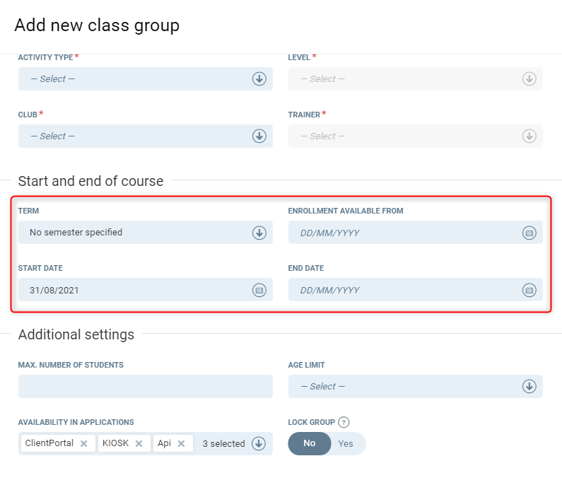 Start date - This will determine when the start date of the group will commence for all enrollments (this can be changed with "Enrollments available from" field. Note if you are planning a new group with a future class start date (eg. for a new group starting in 3 months time) with enrollments starting tomorrow. Set the date here for tomorrow, however the first class you generate will start on the date you want the classes to start (3 months time).