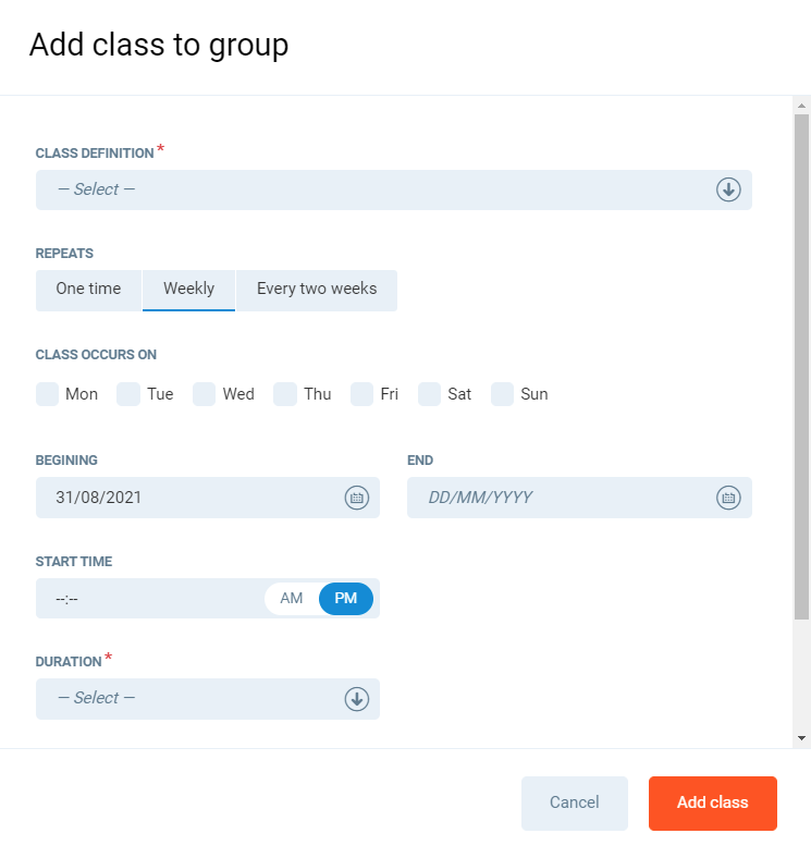 - Weekly - This will repeat the class every week from the start date to the end date, if the end date is blank then it will repeat until further notice.