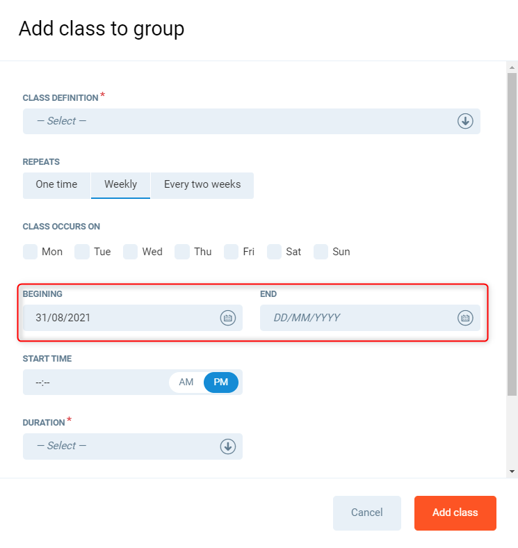 Beginning - The date on when the classes will run from. If this new group is set to start 3 months in the future, set the date here to be 3 months in the future.
