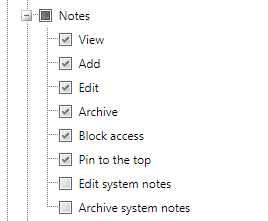 Additional permissions Edit system notes and Archive system notes should be used mindfully, since it allows the user to manage notes added by the system.