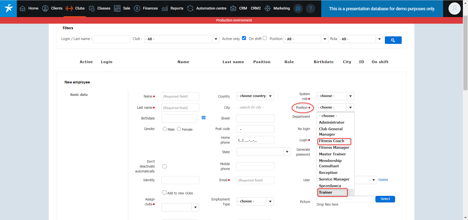 - To add a Trainer, you need to have an Employee position with a system role - Trainer configured. You can do it in PGM -> Clubs -> Employee position section. Read this article for more information.